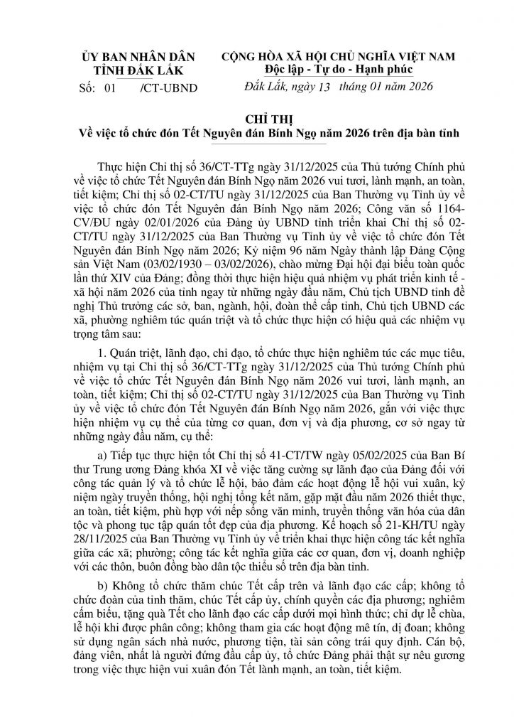 Chỉ thị của UBND về việc tổ chức đón Tết Nguyên đán Bính Ngọ năm 2026