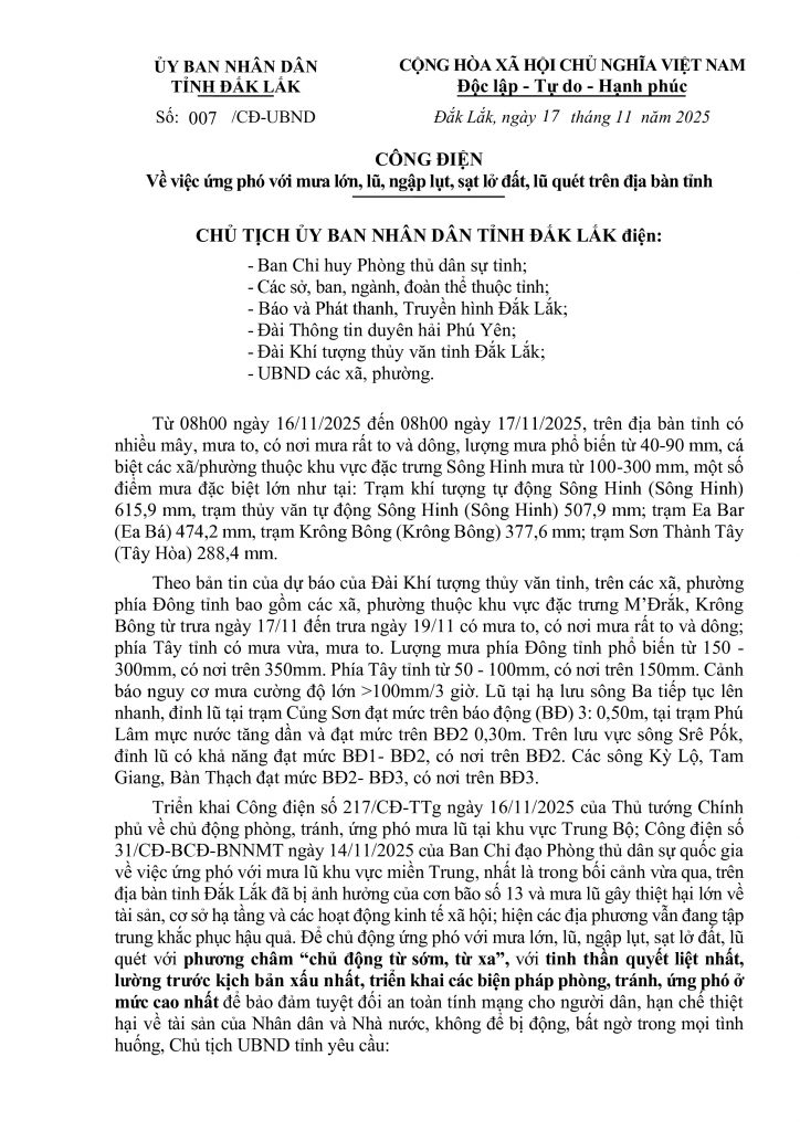 Công điện của Chủ tịch UBND tỉnh về ứng phó với mưa lớn, lũ, ngập lụt, sạt lở đất, lũ quét trên địa bàn tỉnh