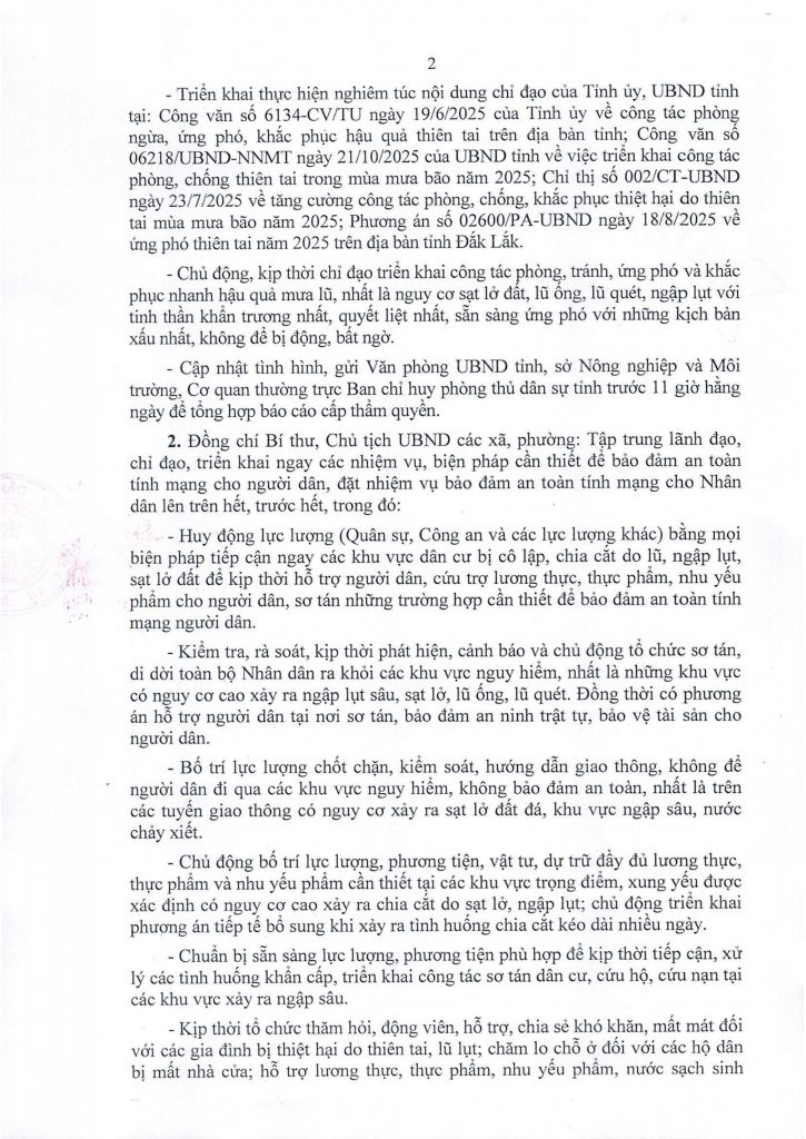 Ngày 19/11/2025, Chủ tịch UBND tỉnh Đắk Lắk ký ban hành Công điện số 008/CĐ-UBND về việc tập trung ứng phó và kịp thời khắc phục hậu quả mưa lũ, ngập lụt, sạt lở đất, lũ quét trên địa bàn tỉnh.