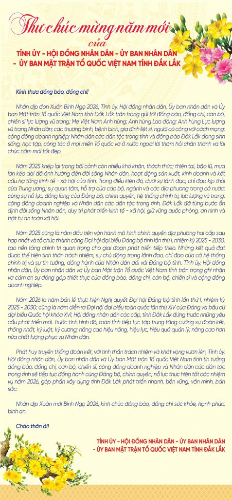 Thư chúc mừng năm mới của Tỉnh ủy – HĐND – UBND – Ủy ban MTTQ Việt Nam tỉnh Đắk Lắk