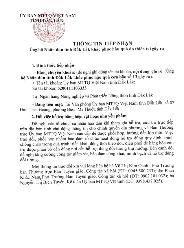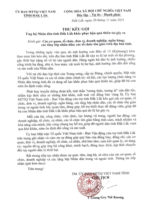 Ngày 20/11/2025, Ủy ban Mặt trận Tổ quốc Việt Nam tỉnh Đắk Lắk vừa có Thư kêu gọi gửi các cơ quan, tổ chức, đơn vị, doanh nghiệp, ngân hàng, các tầng lớp Nhân dân, các tổ chức tôn giáo trên địa bàn nhằm ủng hộ Nhân dân tỉnh Đắk Lắk khắc phục hậu quả thiên tai gây ra.