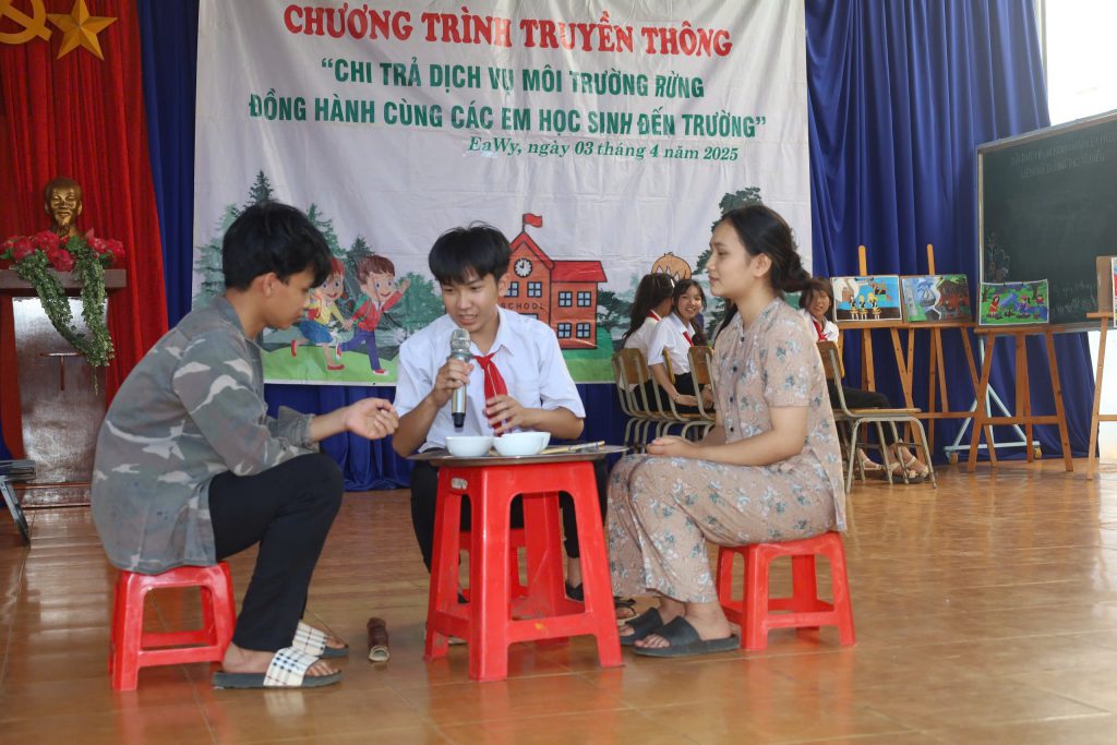 Ngày 03/4/2025 Quỹ Bảo vệ, Phát triển rừng và Môi trường tỉnh Đắk Lắk phối hợp với trường THCS Tô Hiệu – xã Ea Wy huyện Ea H’leo, tổ chức thực hiện buổi sinh hoạt ngoại khóa lồng ghép truyền thông Chính sách chi trả dịch vụ môi trường rừng đồng hành cùng học sinh đến trường. Chương trình với nhiều hoạt động ý nghĩa đã góp phần tuyên truyền sâu rộng đến các em học sinh, thầy cô giáo và người dân địa phương trong việc nâng cao nhận thức quản lý, bảo vệ rừng – nguồn tài nguyên quý giá của nhân loại. Cùng tham gia buổi truyền thông có lãnh đạo chính quyền địa phương, Hạt Kiểm lâm, các đơn vị chủ rừng đóng chân trên địa bàn.